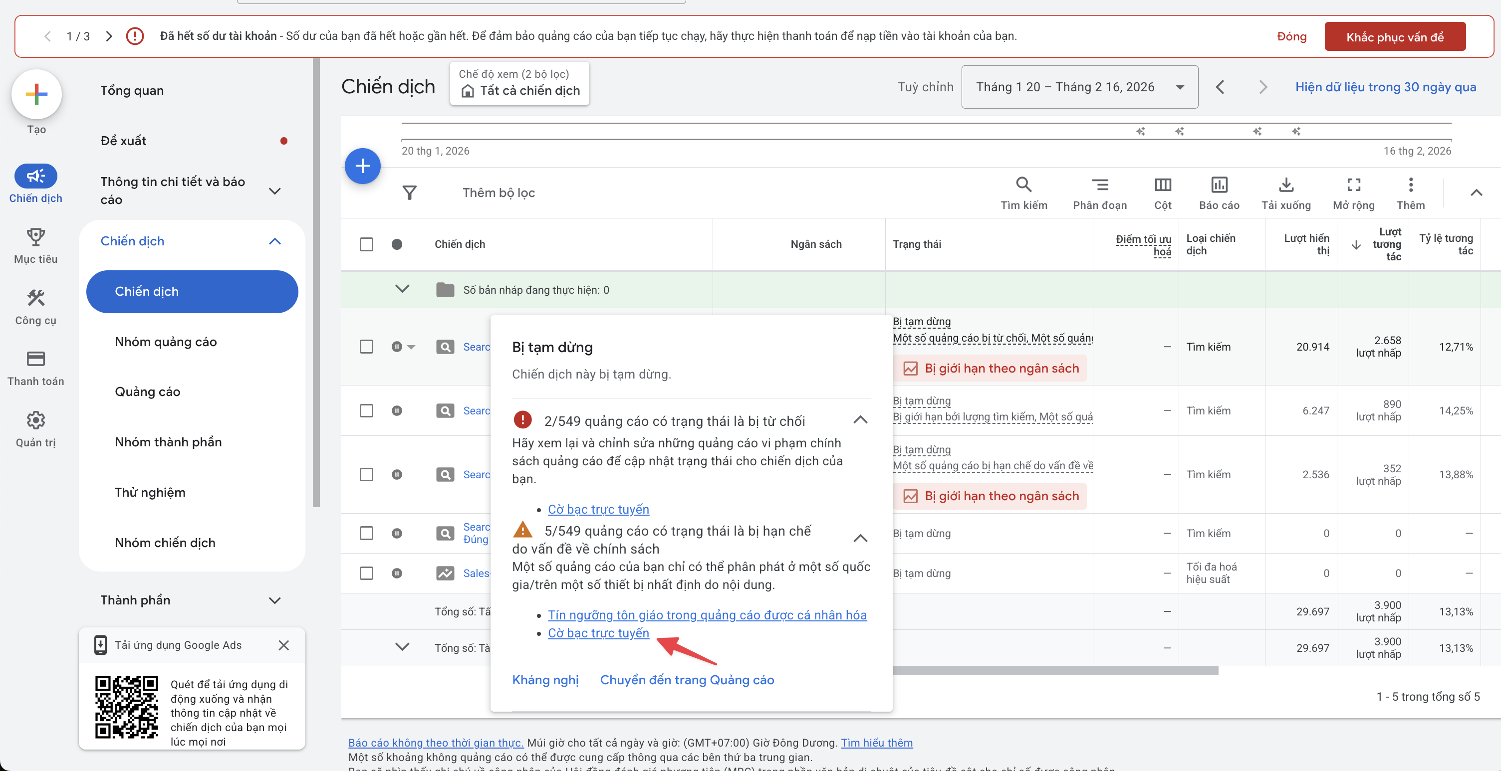 Mình bị cảnh báo Cờ bạc trực tuyến và không chạy được QC, bạn xử lý được cái này ko?