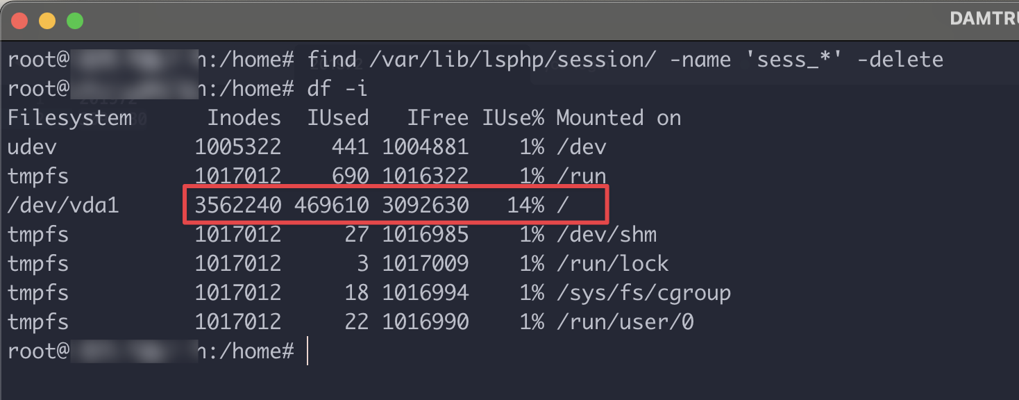 Sau khi chạy lệnh xóa xong, bạn hãy thử kiểm tra lại xem Inodes đã giảm hay chưa. Và ở trường hợp của mình, số lượng Inodes đã giảm từ 100% xuống còn 14%.
